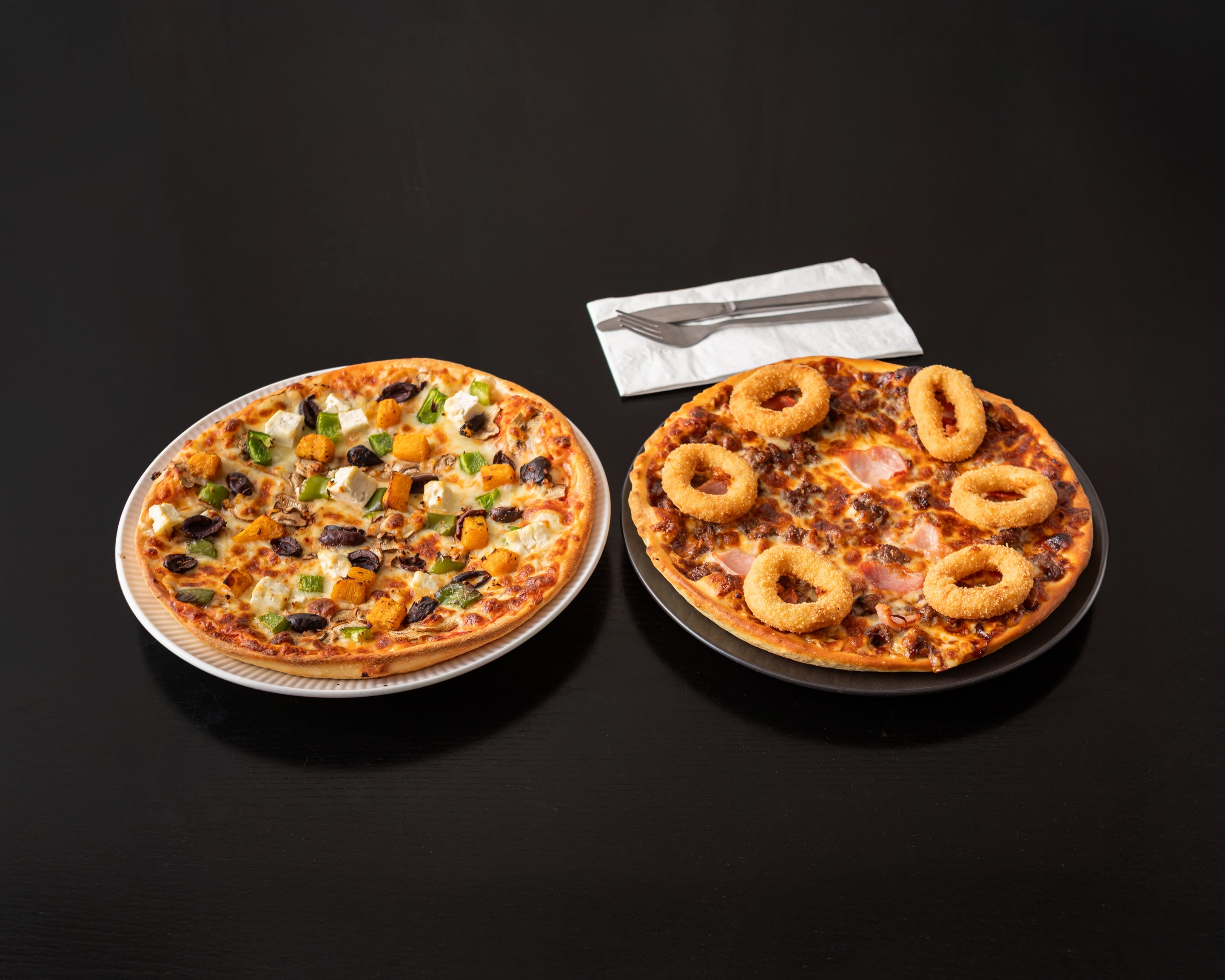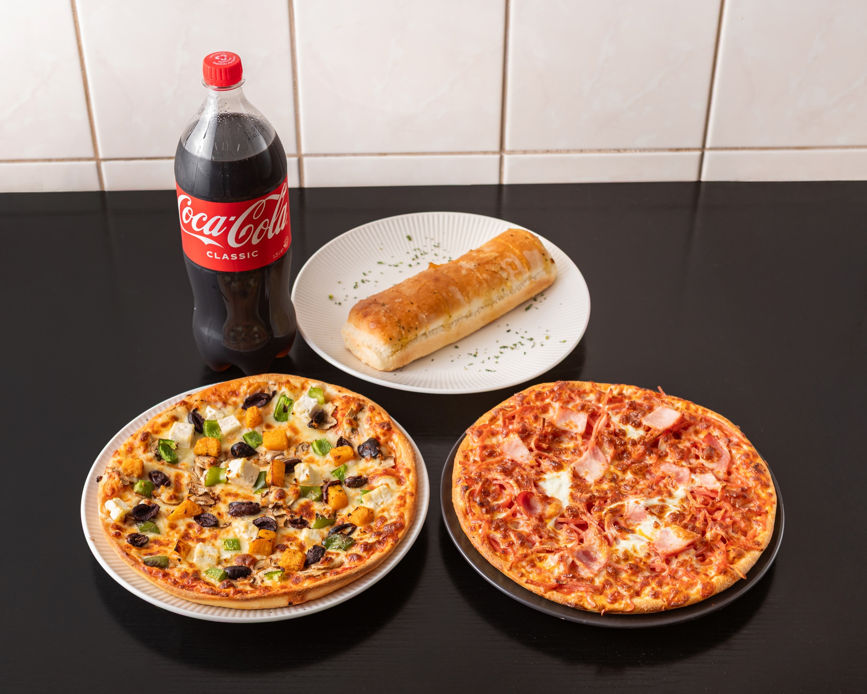 Choose any 2 large traditional/classic pizza, garlic bread and bottle of soft drink