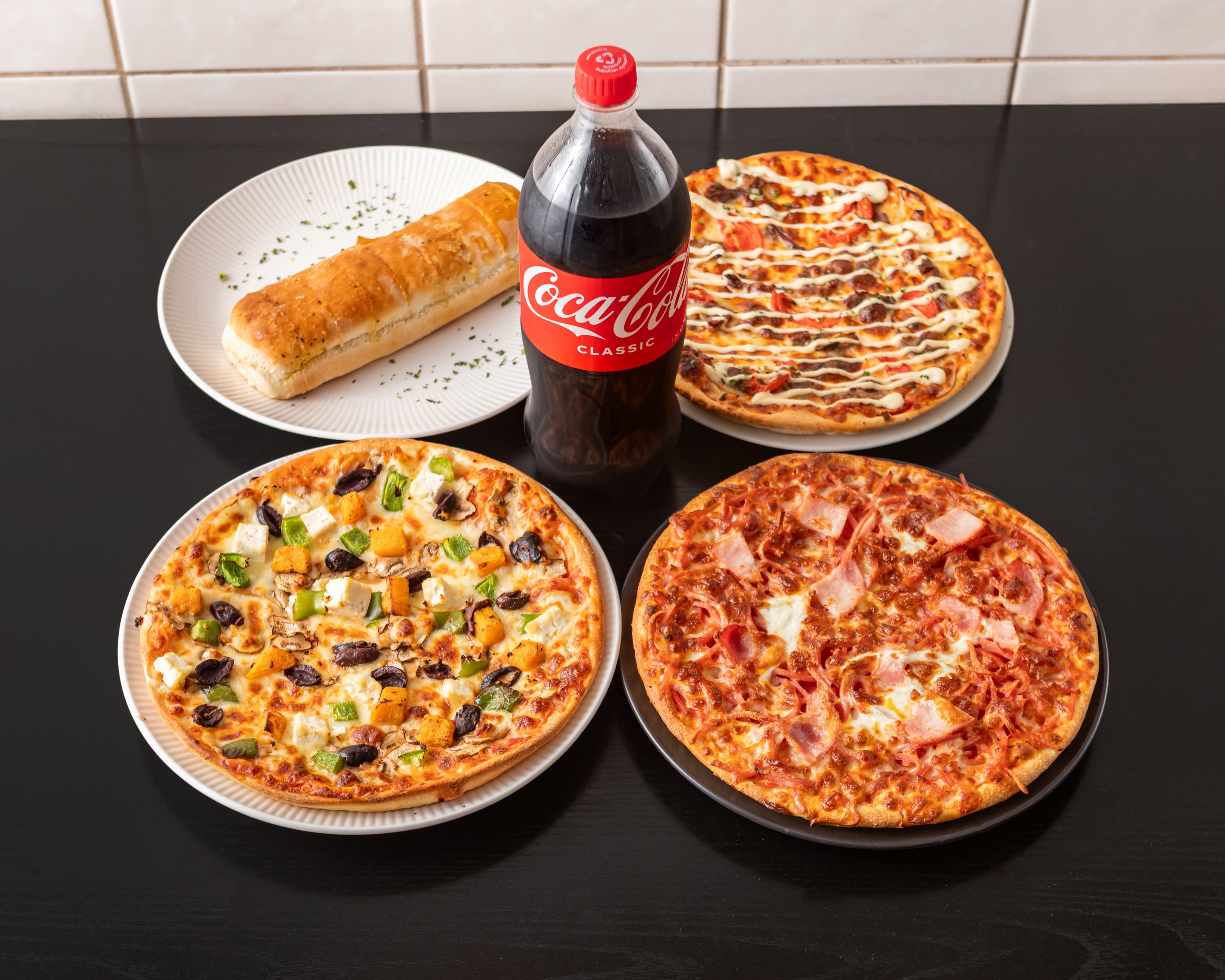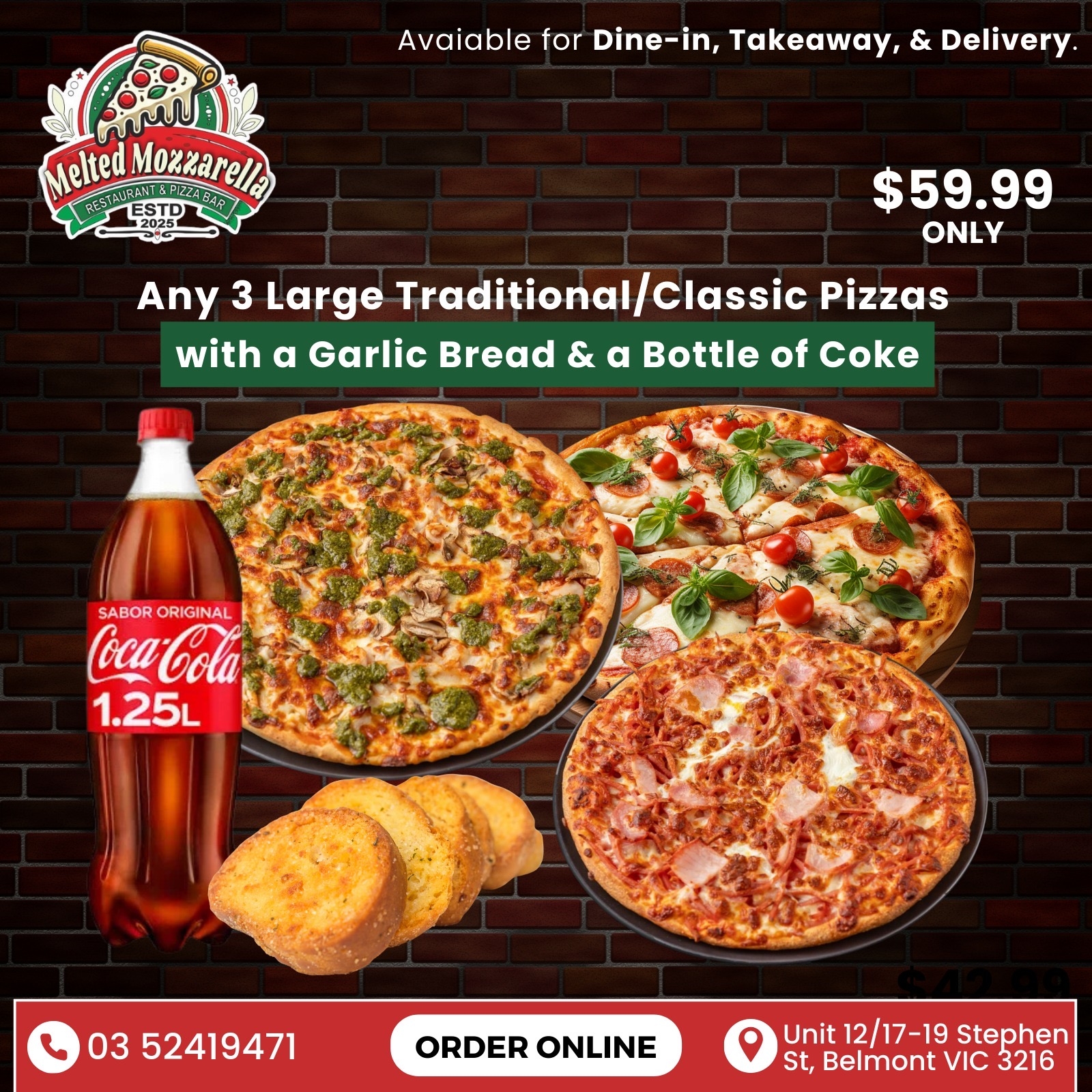 Choose ANY 3 large pizzas, get Garlic Bread + a Soft Drink for just $59.99. A deal too good to miss. Order Now!