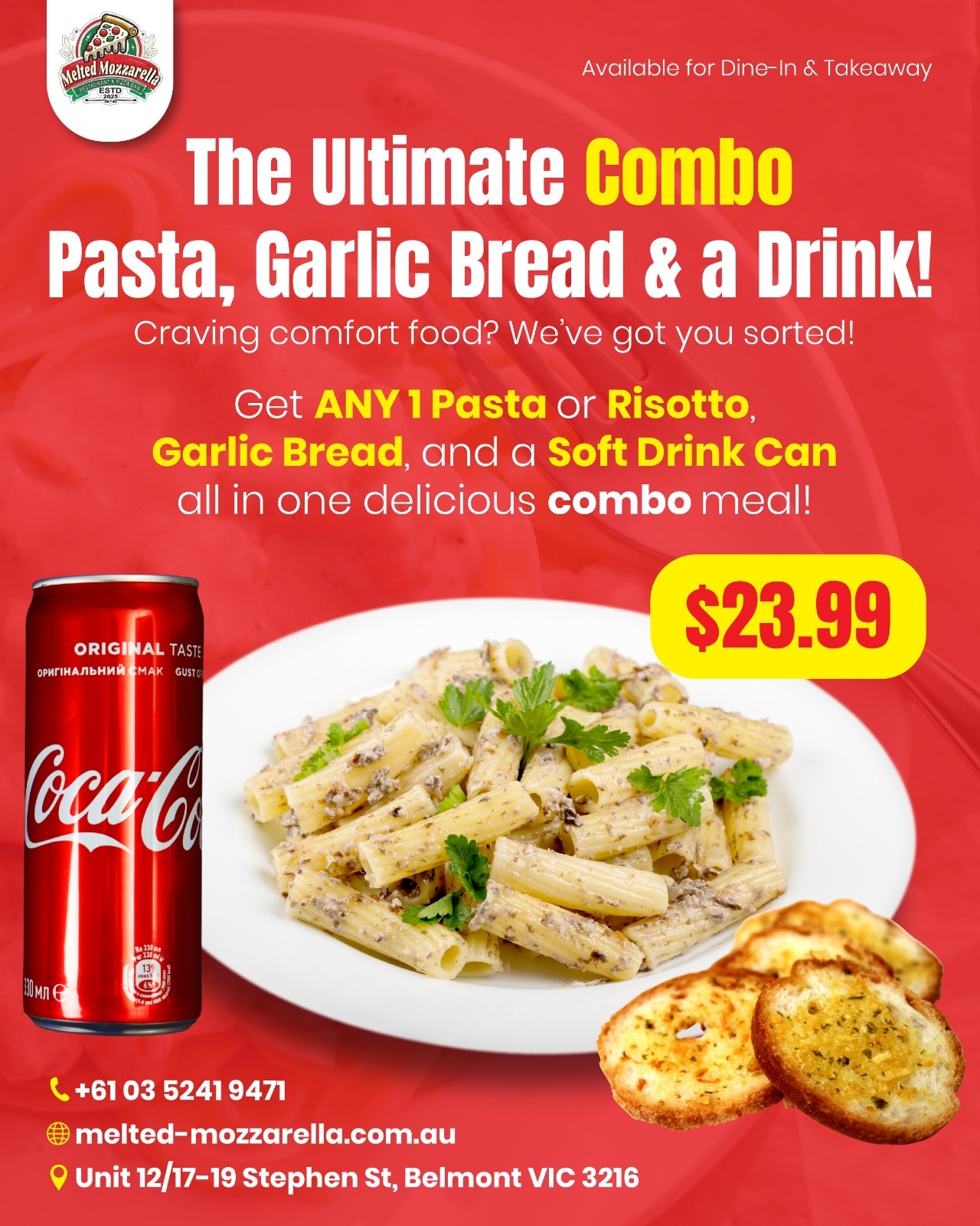Any 1 pasta/risotto,garlic bread and a can of soft drink