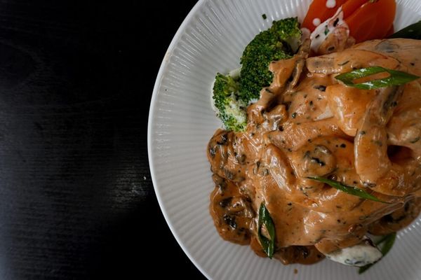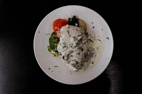 Pan-fried chicken breast topped with prawns, mushrooms and rose sauce served with roasted potatoes and vegetable