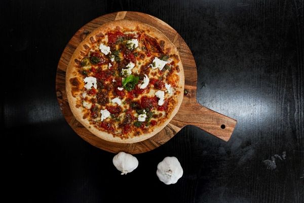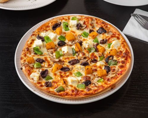 Tomato Base, Capsicum, Mushroom, Olives, Onion, Roasted Pumpkin, Feta Cheese, Garlic and Herbs.