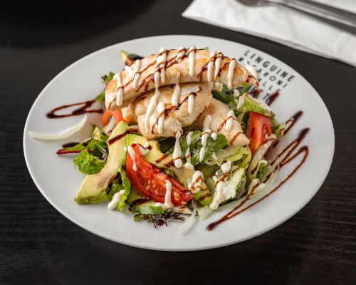 Grilled chicken, mixed lettuce, cucumber, onion tomato, avocado with drizzle of aioli & balsamic glaze
