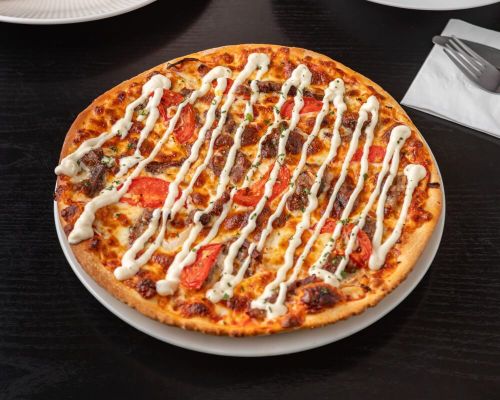 Tomato Base, Onion, Tomato, Cheese and Tzatziki.