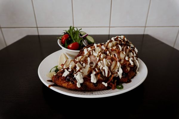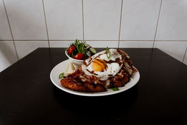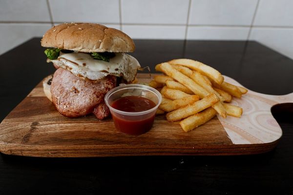 Beef patty, onion, lettuce, tomato, egg, crispy bacon with BBQ aioli sauce