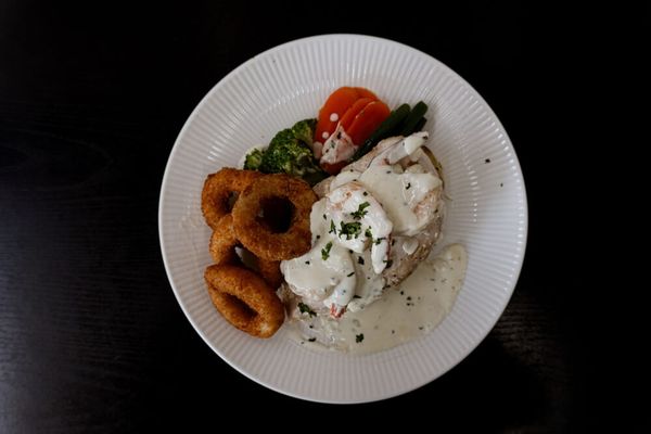Pan-fried chicken breast fillet topped with prawns and calamari, finished in a creamy garlic lemon sauce, served with roasted potatoes and vegetables