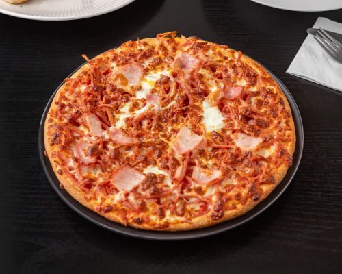 Tomato Base, Beef, Ham, Pepperoni, Capsicum, Olives and Pineapple.